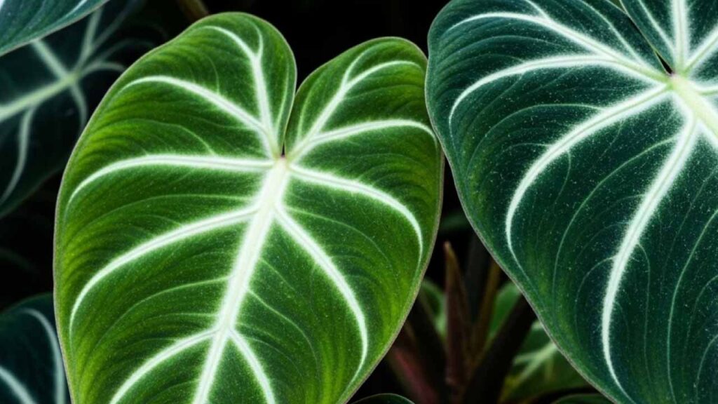 Philodendron gloriosum with large velvety dark green leaves and white
