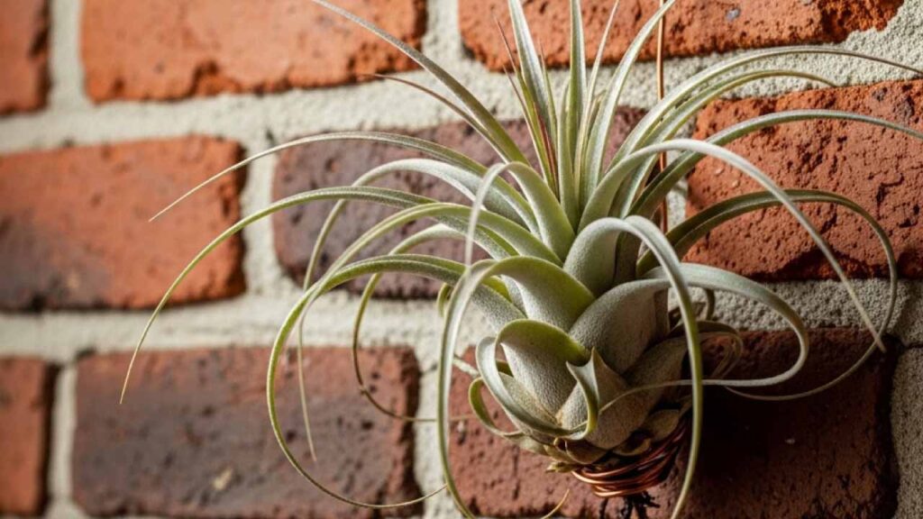 Tillandsia ionantha attached to exposed brick wall with copper wire,