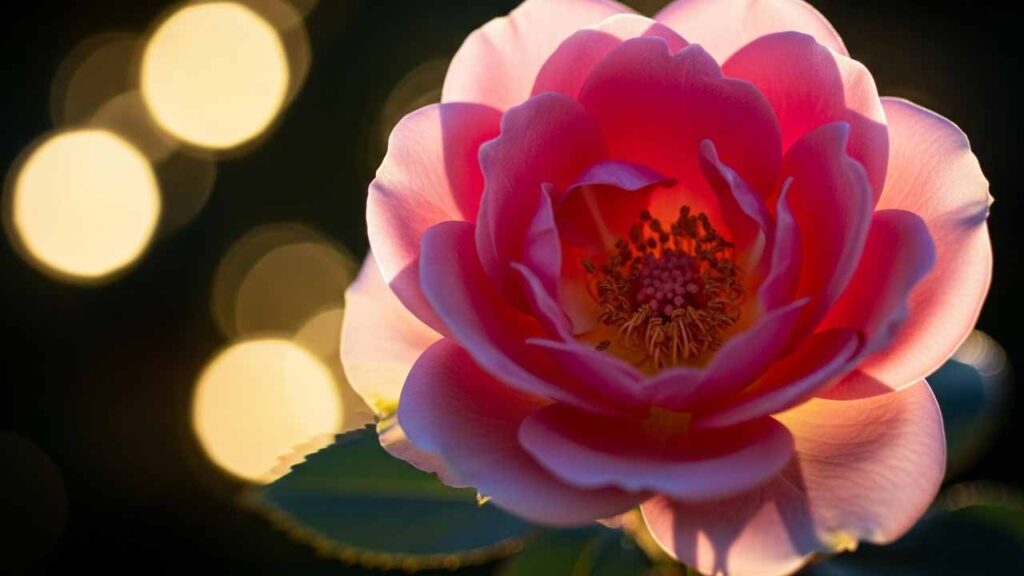 backlight from behind subject, rim lighting on leaf and petal edges,