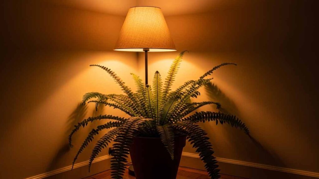 Boston fern in terracotta pot in bedroom corner, warm table lamp